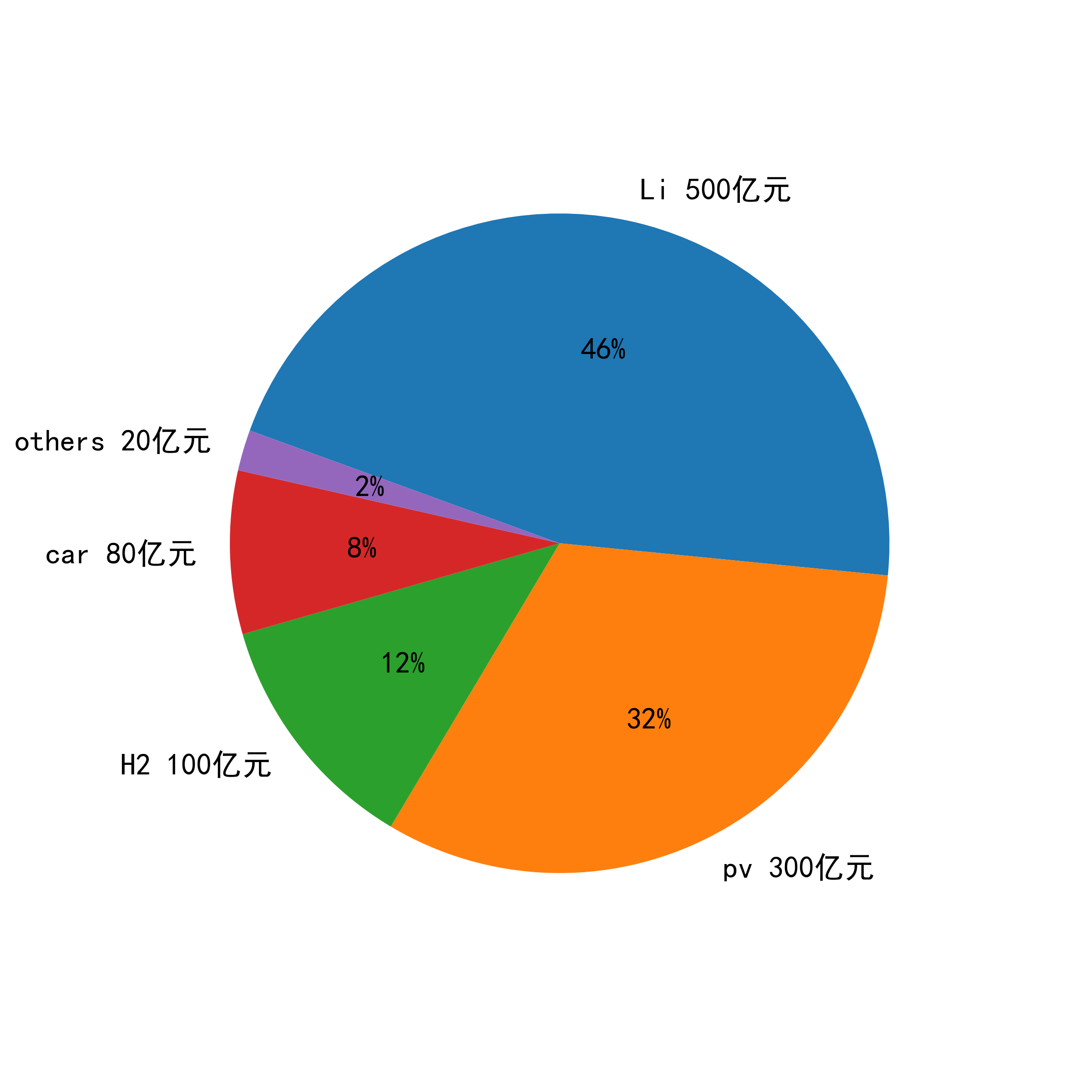 plt.pie(x=[460,320,120,80,20], labels=['Li 500亿元','pv 300亿元','H2 100亿元','car 80亿元','others 20亿元'],#为饼图添加标签说明