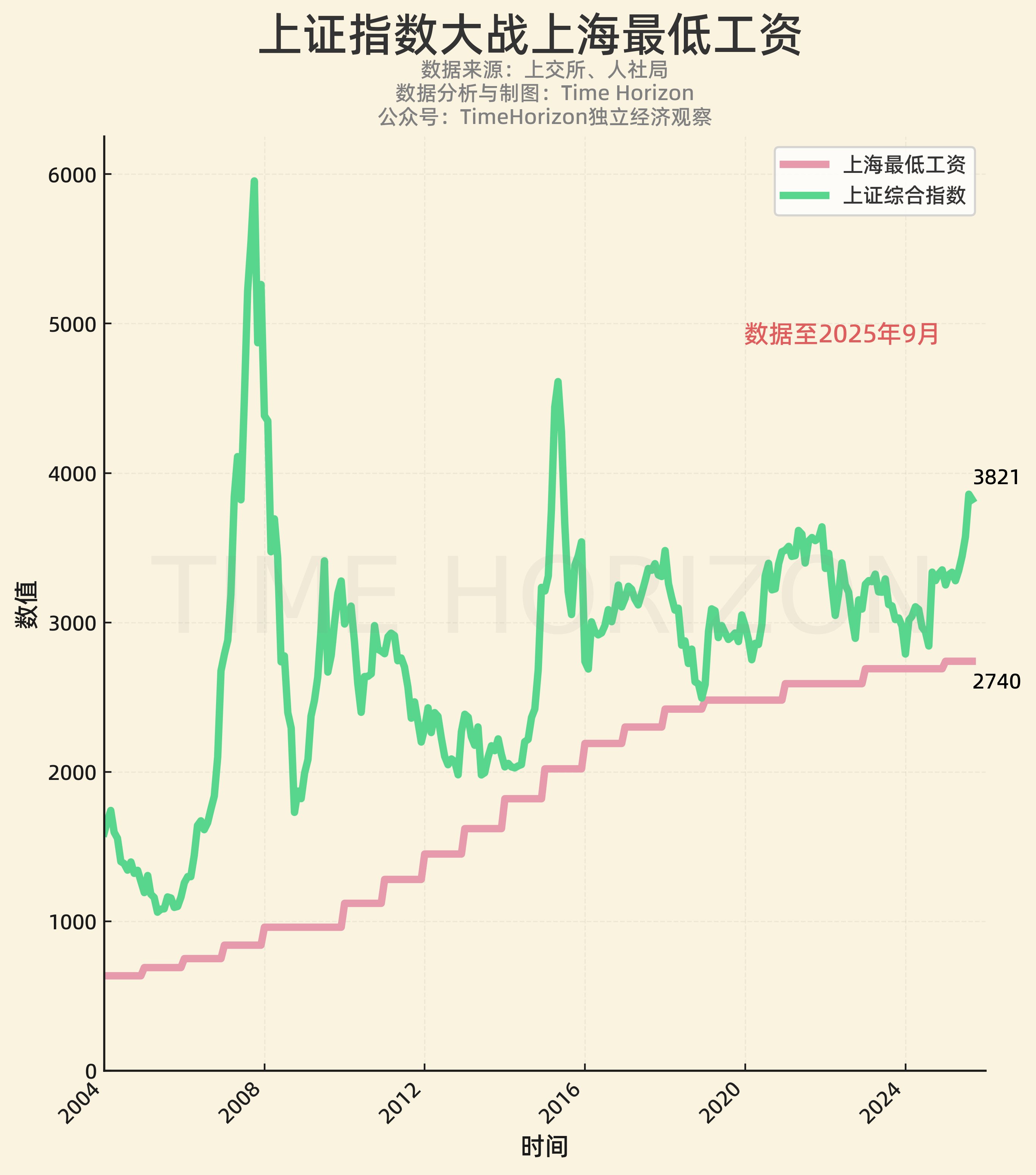 1、上证指数vs上海最低工资。 最低工资可能反应了社会主义共同富裕制度下,社会财富分配水平。