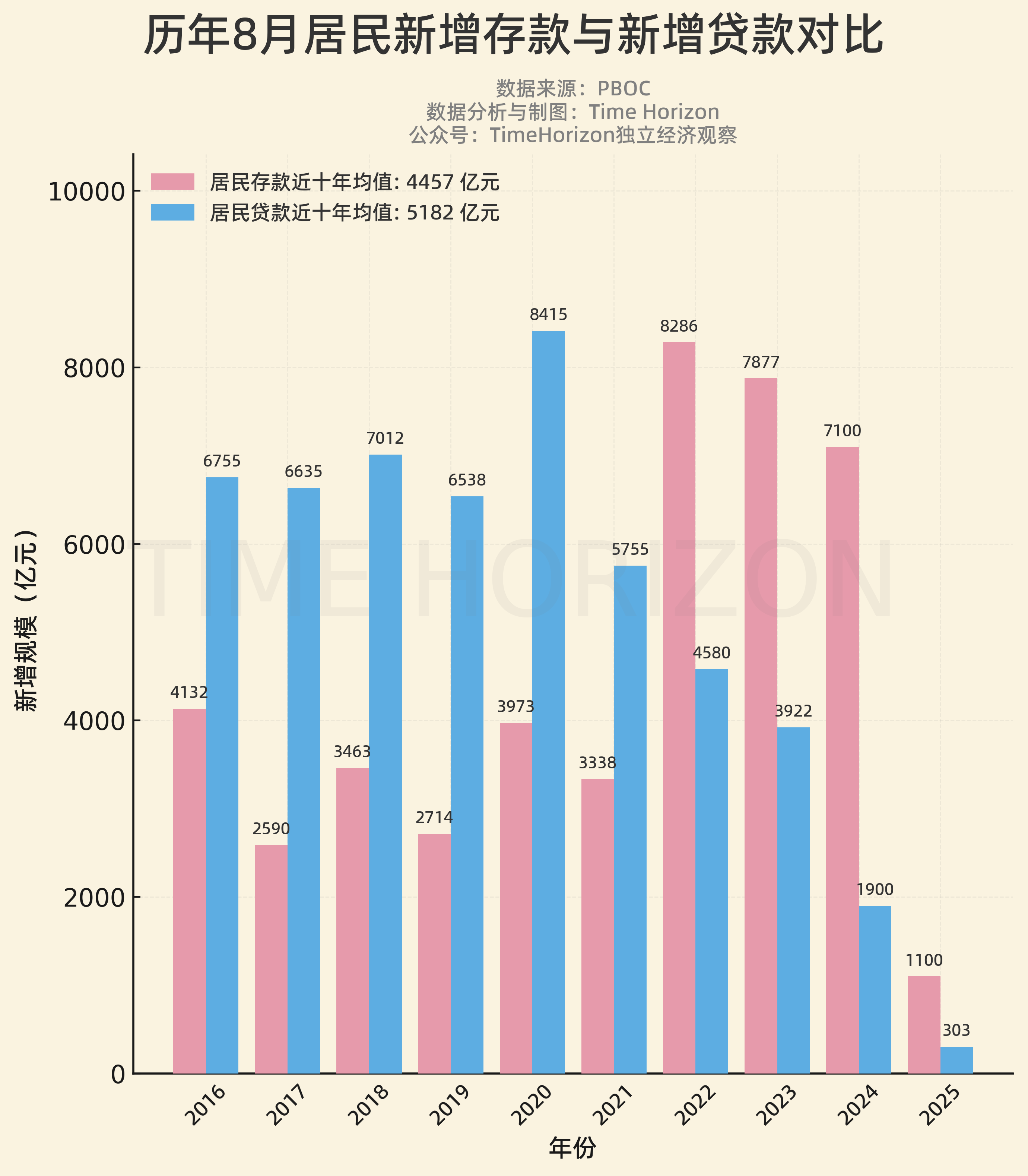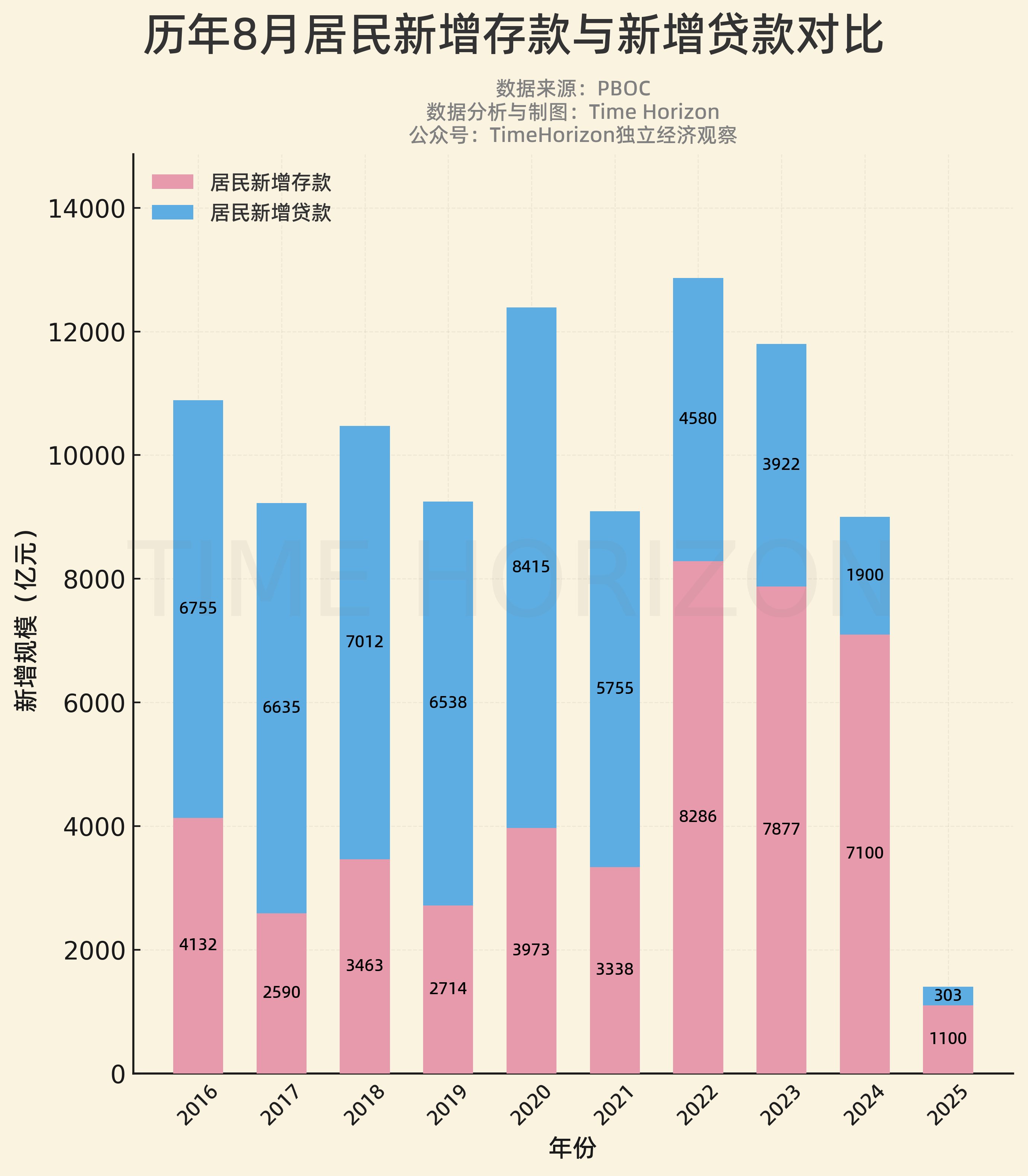 历年8月居民新增存款和新增贷款: